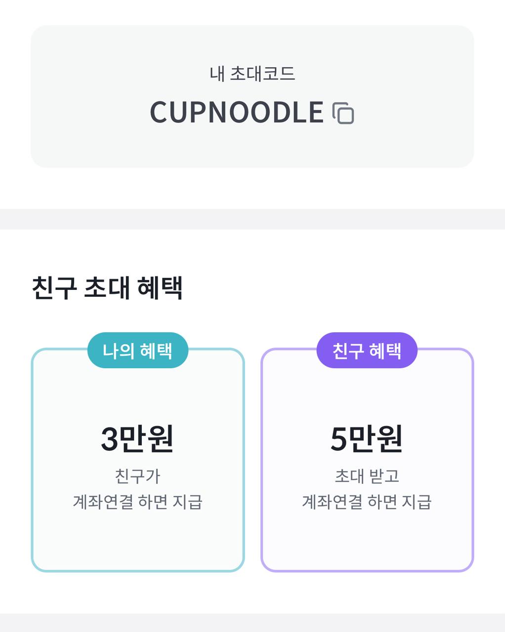 • 초대코드 리워드 5만원 : 가입 후 30일 이후 출금 가능
