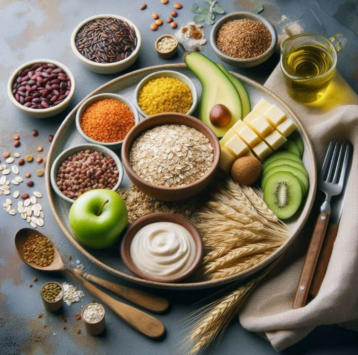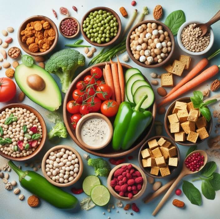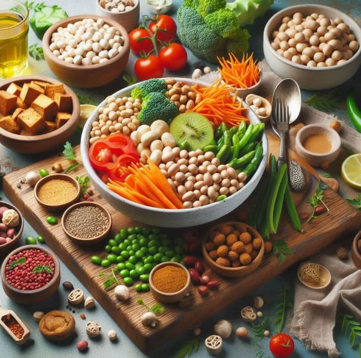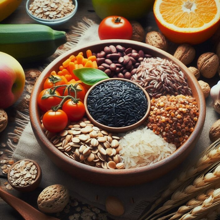 통곡물, 콩류, 채소, 건강한 지방 등을 중심으로 구성됩니다.