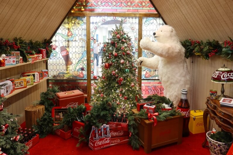 특히, 거대한 크리스마스 트리와 귀여운 폴라 베어 마스코트가 인상적입니다.