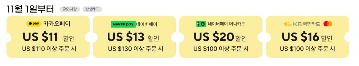 • 카카오페이: $100 이상 결제 시 $11 할인