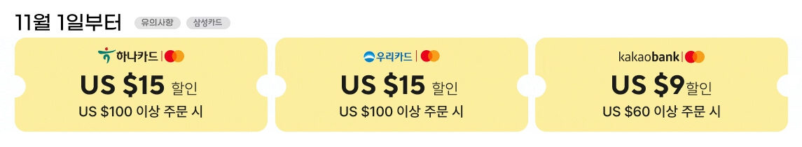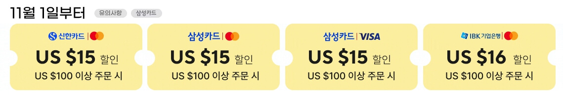 • 국민카드: $100 이상 구매 시 $11 할인