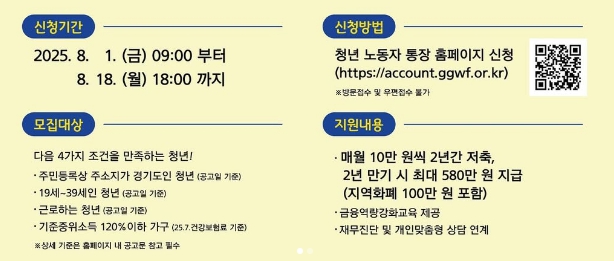 접수는 청년 노동자 통장 공식 홈페이지를 통해 이뤄지며, 가구당 1명만 신청할 수 있어요.