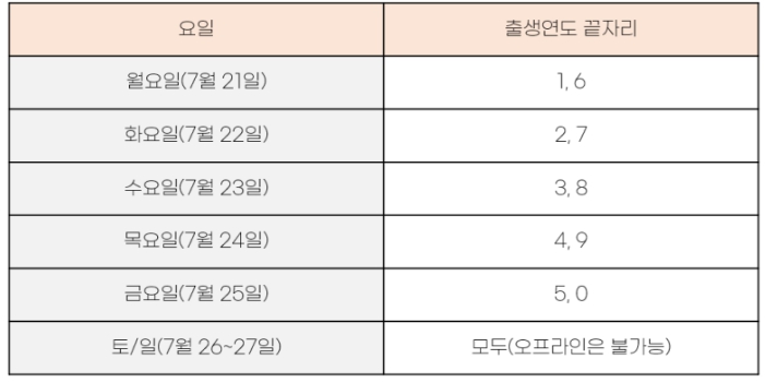 첫 주(7/21~7/27)는 출생연도 끝자리 요일제가 적용됩니다.