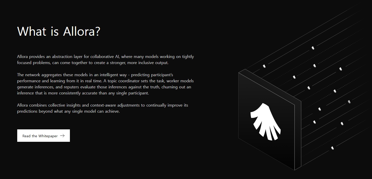 "Allora는 지능에 대해 Bitcoin이 에너지에 대해 한 일을 수행합니다". 누구나 지능을 가치로 직접 전환할 수 있는 개방형 시장을 창조하는 것이 목표입니다. AI가 더 강력하고 중요한 도구가 되면서 소수의 기업이 통제하는 위험을 방지하고, 분산형 커뮤니티를 통해 AI를 민주화합니다.